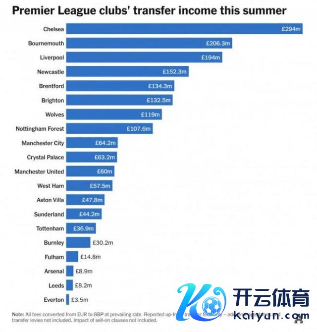 今夏英超独一切尔西和伯恩茅斯的卖东谈主收入比利物浦更多