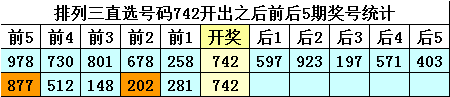 四、成列三直选号码742历史上开出2次,其前后五期奖号永诀为:
