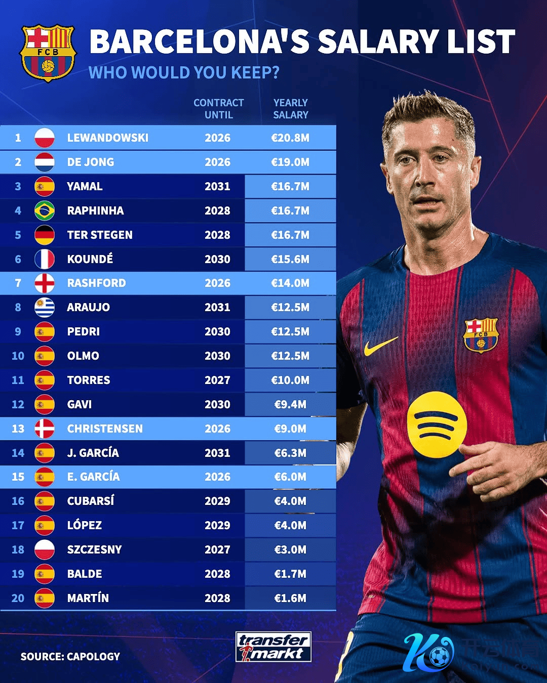 虎扑10月10日讯德转网站盘货了巴萨一线队球员年薪名次,莱万2080万居首,德容亚马尔分列二三,千万年薪球员有10位。