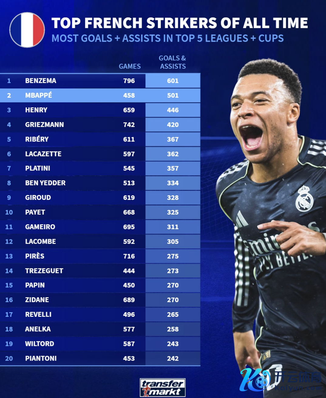 虎扑02月17日讯 德转统计了法国籍球员俱乐部各赛事参与进球榜(仅统计五大联赛以及列国杯赛)。
