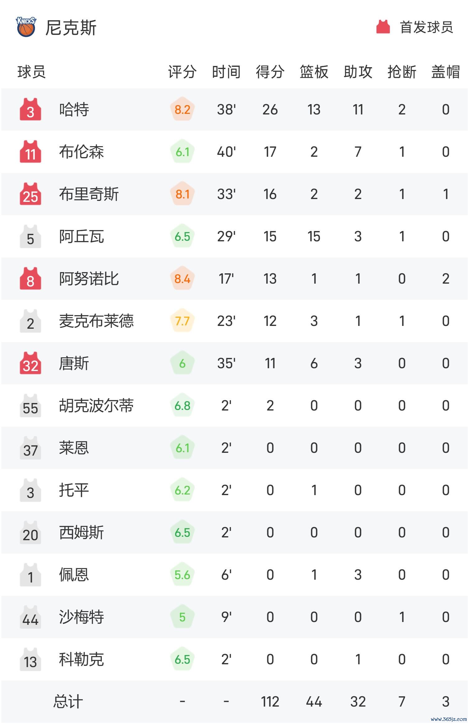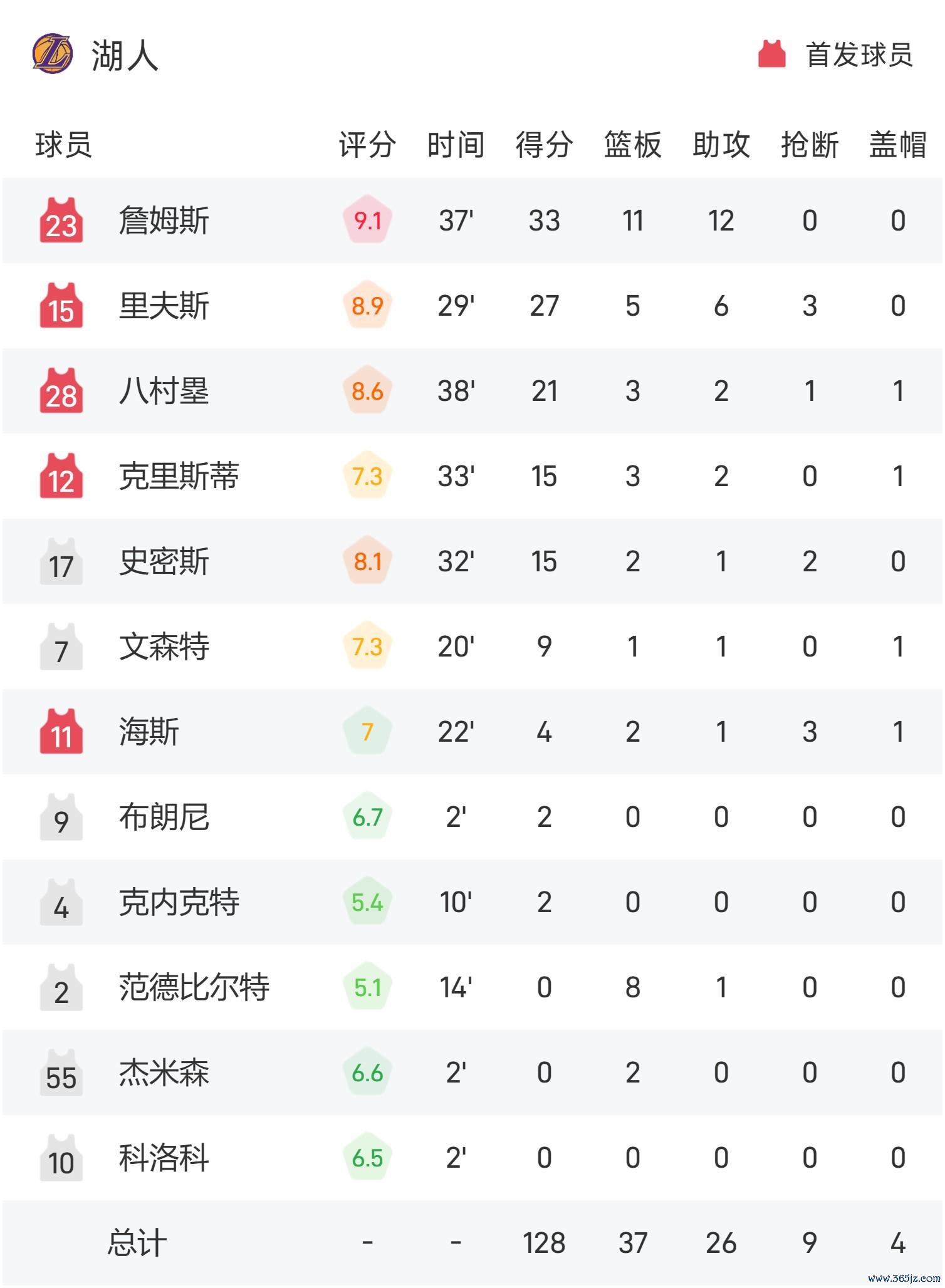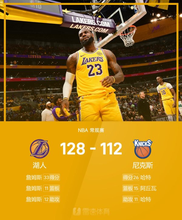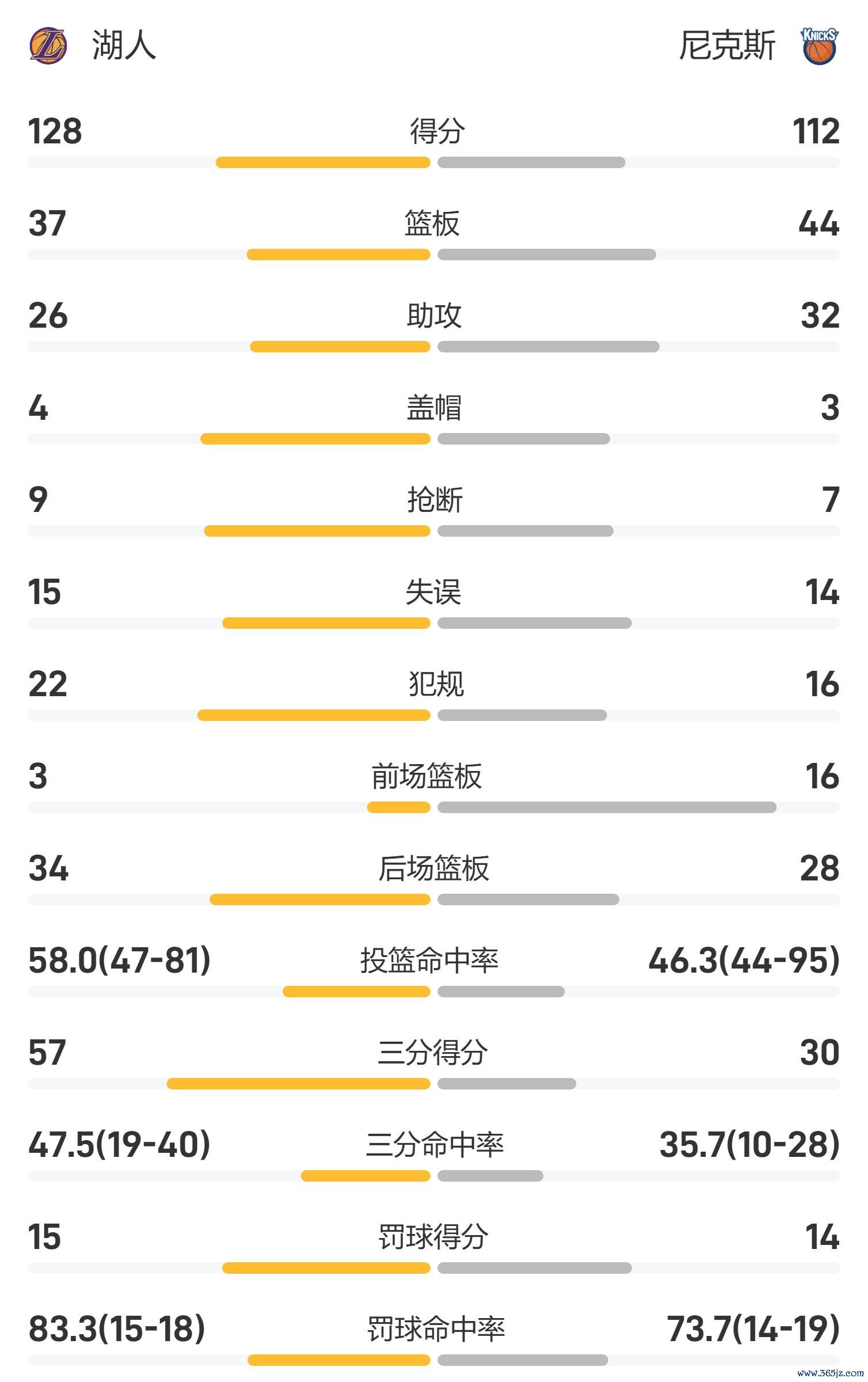 最终,尼克斯主场112-128不敌湖东谈主,球队无缘六连胜。