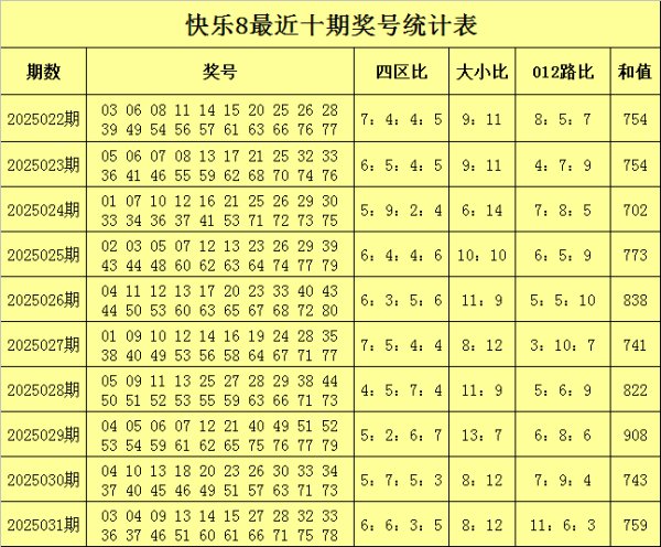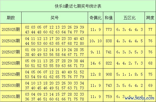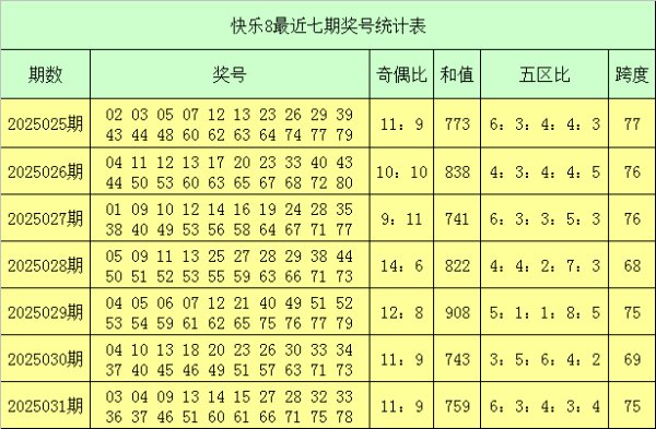 福彩欢喜8第2025031期开出奖号:03 04 09 13 14 15 27 28 32 33 36 37 46 51 60 61 66 71 75 78,其中奖号奇偶比为11:9体育集锦,和值为759,跨度75,五区比为6:3:4:3:4。