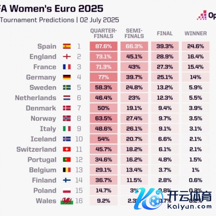 7月2日讯 2025年女足欧洲杯行将开赛,Opta通过超等盘算机测度了各队的夺冠概率。