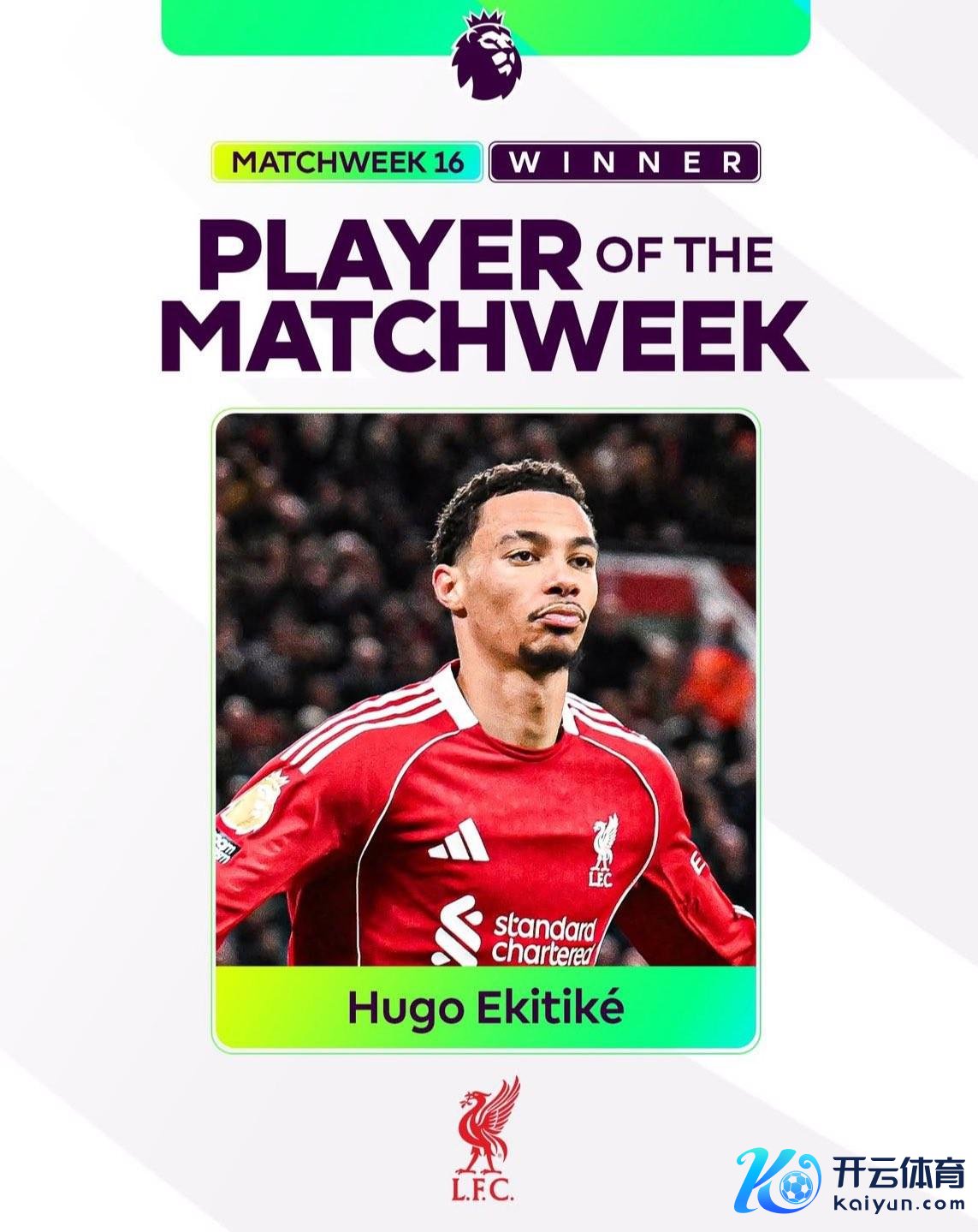 北京时分12月17日,英超官方通知,埃基蒂克到手当选联赛第16轮最好球员。