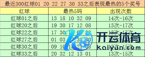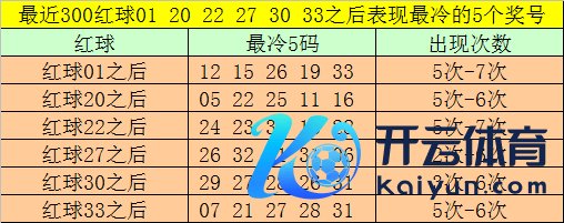 红球冷码统计:双色球第2026005期开出红球奖号分辩为:01、20、22、27、30、33,在最近300期开奖中,各号码出现之后其下期出现最少的5个红球分辩为: