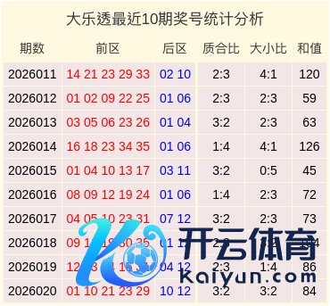 大乐透2026020期开奖,本期奖号:前区01、10、21、23、29,后区10、12。其中前区奖号质合比为3:2,大小比为3:2,和值为84。