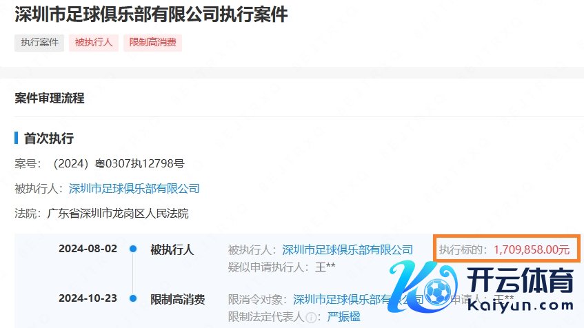 11月09日讯 据有名工商信息查询平台企查查音问,近日深圳市足球俱乐部被李源一、孙可等球员央求限高,欠酬劳额齐有上百万。