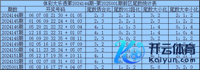 体彩大乐透第2025001期开奖号码为:05 08 16 17 27 + 04 07其中前区奖号奇偶比为3:2体育录像/图片,大小比为1:4,012路为1:1:3,前区余数质合比为3:2,012路比为1:2:2,大小比为5:0,大中小比3:2:0。