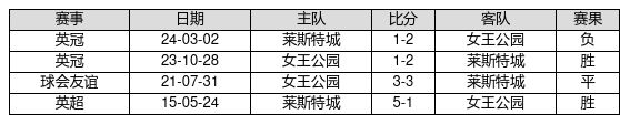 莱斯特城 VS 女王公园两队近10年的交战次数为4场,莱斯特城2胜1平1负,赢球概率为50.0%,平局概率为25.0%,输球概率为25.0%。