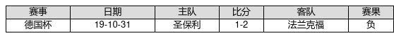 圣保利 VS 法兰克福两队近10年的交战次数为1场,圣保利0胜0平1负,赢球概率为0.0%,平局概率为0.0%,输球概率为100.0%。
