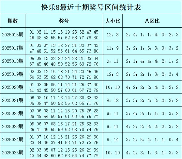 福彩夸耀8第2025025期奖号为:02 03 05 07 12 13 23 26 29 39 43 44 48 60 62 63 64 74 77 79,其中奖号大小比为10:10,八区比为4:2:3:1:3:1:3:3。