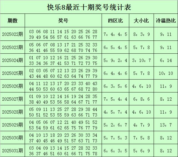 福彩高亢8第2025031期开奖转头:03 04 09 13 14 15 27 28 32 33 36 37 46 51 60 61 66 71 75 78,其中奖号四区比为6:6:3:5,冷温热码比为5:6:9,大小比为8:12,和值为759,同尾号码为51 61 71、03 13 33、04 14、15 75、36 46 66、27 37、28 78。