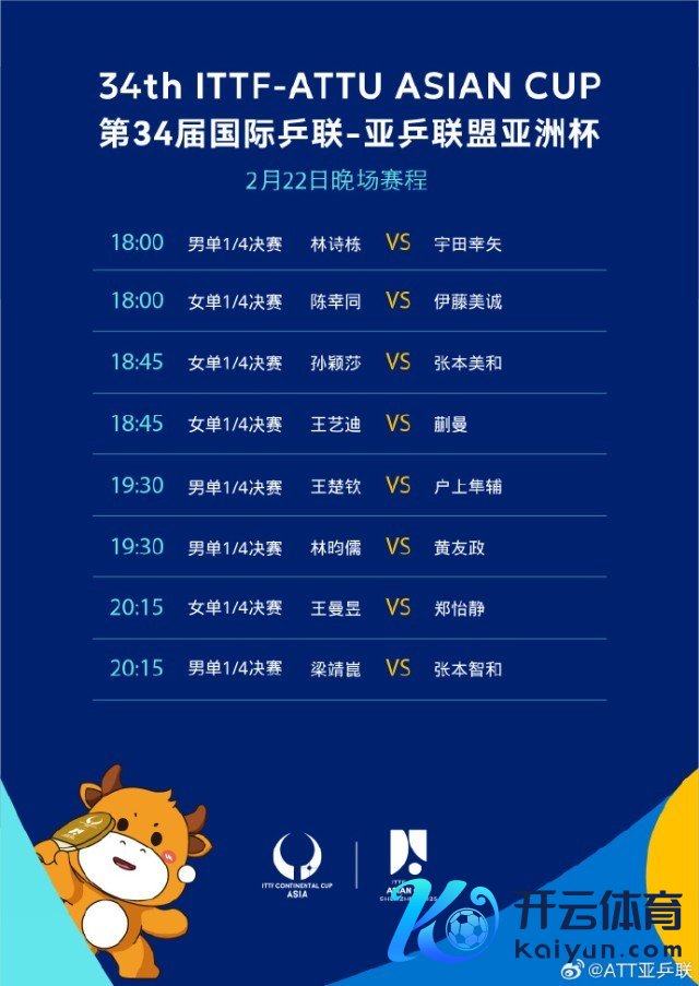 2月22日晚,2025年乒乓球亚洲杯在深圳继续进行。凭据赛程,今天18点起将同步进行男单1/4决赛和女单1/4决赛,具体有哪些安排呢?