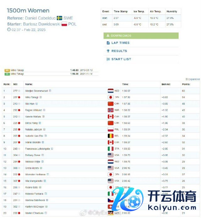 在女子1500米比赛中,荷兰选手格罗恩伍德以1分56秒67夺冠,日真名将高木好意思帆和中国选手韩梅分获亚军和季军,杨滨瑜名循序六。