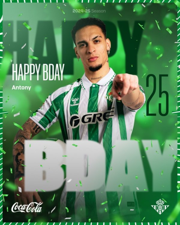 贝蒂斯为安东尼制作了寿辰海报,并写说念:寿辰怡悦,安东尼!🐐这名右边锋今天25岁了!