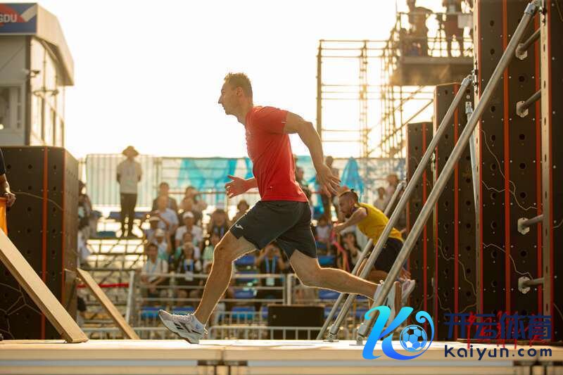 8月13日,成王尘间运会跑酷须眉竞速决赛,捷克队选手(红衣)在夕阳下高速奔走。汪龙华/摄