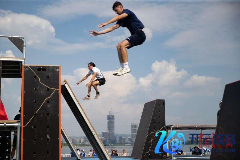 8月13日,成王尘间运会跑酷须眉竞速比赛,墨西哥选手(白衣)与斯洛伐克选手(蓝衣)争夺晋级决赛的限额。汪龙华/摄