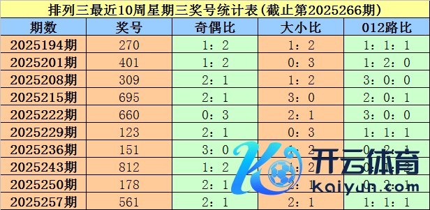 胪列三第2025257期(上周星期三)奖号为561。其中奖号奇偶比为2:1,大小比为2:1,012路比为1:1:1。
