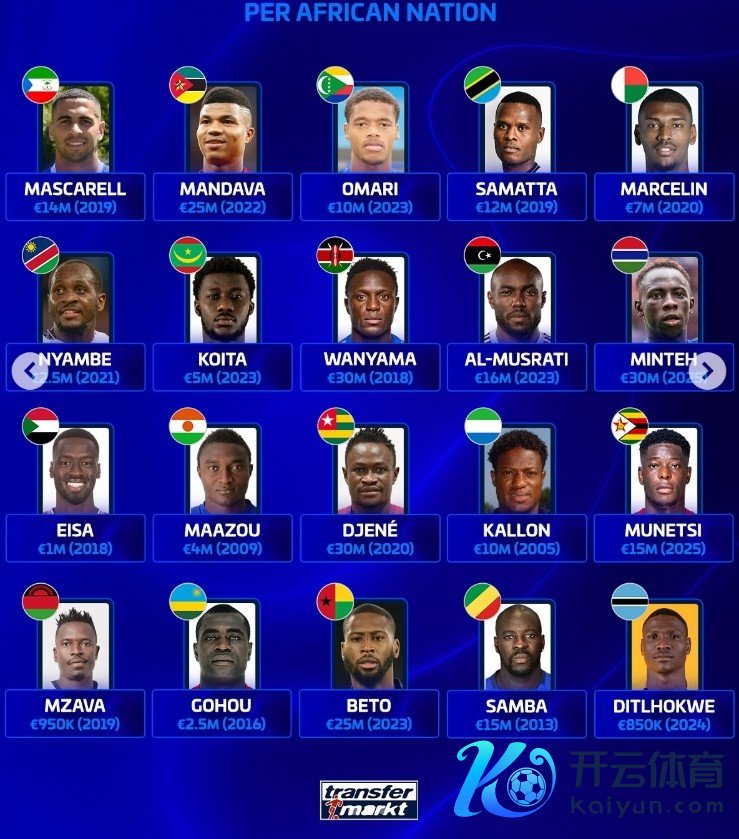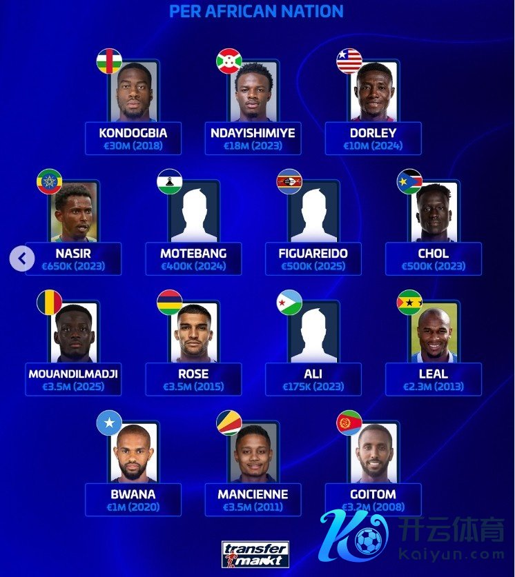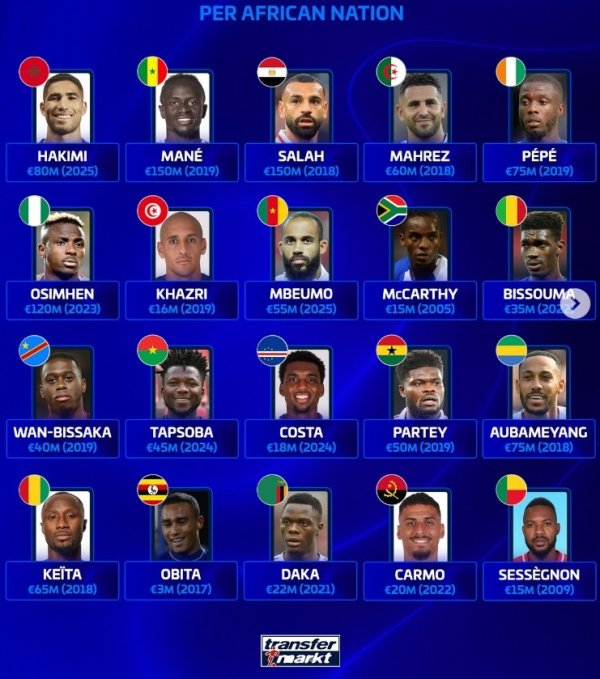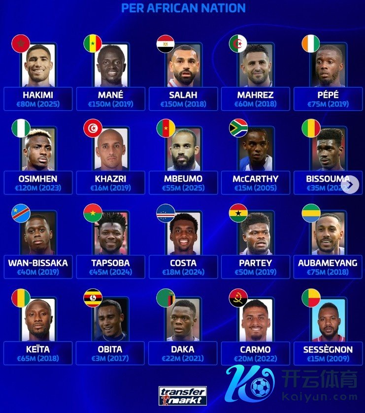 以下为非洲列国历史身价最高球员具体身价情况: