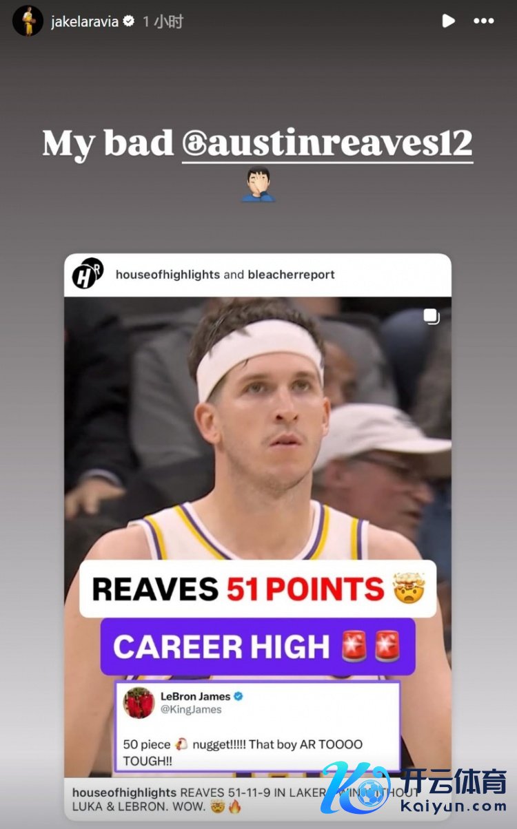 比赛终末技术,拉拉维亚快攻被帽,使得里夫斯没偶然取得50分三双;对此,他赛后在INS转发了里夫斯的数据,并写谈:“我的错@里夫斯🤦♂️。”