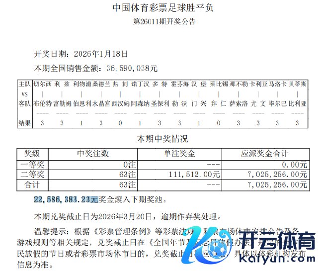 北京本事1月18日,输赢彩第26011期开奖效果揭晓,本期足彩头奖空开,二等奖开出63注,单注奖金111,512元体育赛事直播,22,586,383.23元奖金滚入下期奖池;任九开出277注52,497元。本期十四场销量为36,590,038元,任九总投注额为22,721,682元。