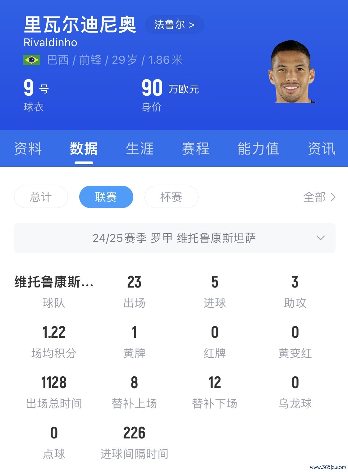 里瓦尔迪尼奥司职中锋,也能客串边锋、中场,身高1米87,先遵循于罗马尼亚甲级联赛球队法鲁尔,身价90万欧。