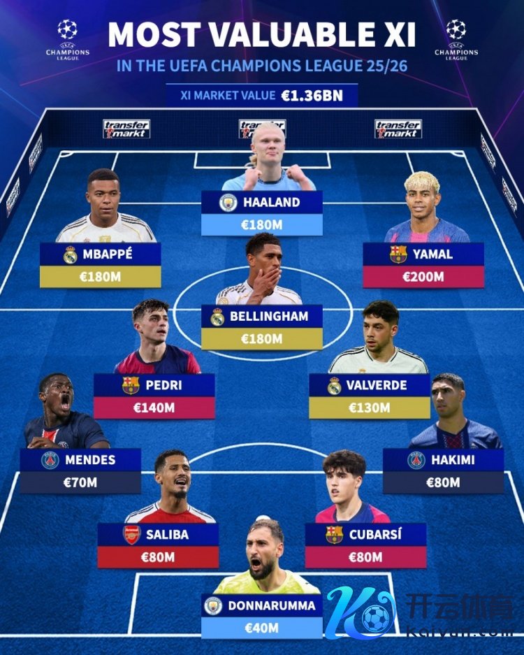9月16日讯 德国转会市集列出了本赛季欧冠身价最高声势,亚马尔、姆巴佩、哈兰德在列,总价13.6亿欧。