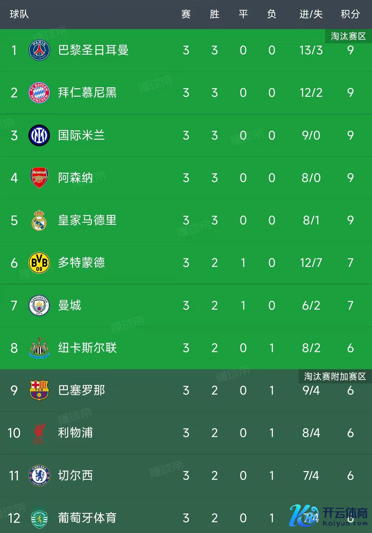 现在拜仁总进球数12球仅次于巴黎,暂列第二名。意甲球队国米4-0大捷圣吉罗斯结合,净胜球是9个暂列第三名。阿森纳主场4-0大捷马竞,净胜球是8个暂列第四名,他们和国米是唯二莫得失球的!皇马今天凌晨主场凭借贝林厄姆的补射进球,1-0小胜尤文,迎来三连胜,净胜球是+7,暂列第5名。