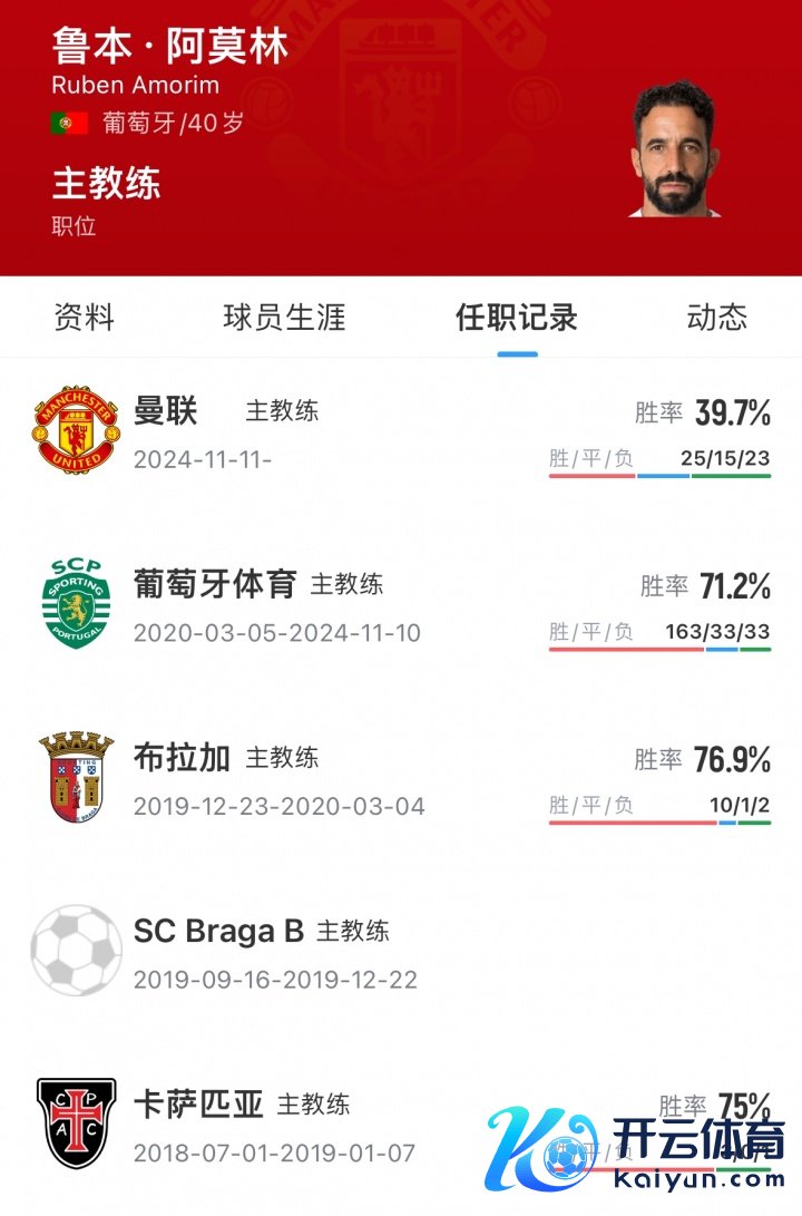 2024年11月,阿莫林出任曼联主帅,带队于今获取25胜15平23负,带队一年胜率不及40%。