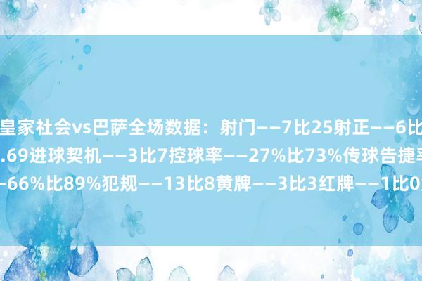 皇家社会vs巴萨全场数据:射门——7比25射正——6比9预期进球——1.01比3.69进球契机——3比7控球率——27%比73%传球告捷率——66%比89%犯规——13比8黄牌——3比3红牌——1比0角球——6比8 下球网体育信息